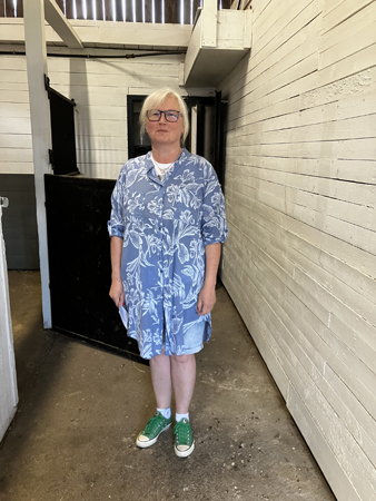 Anna provar kläder i stallet