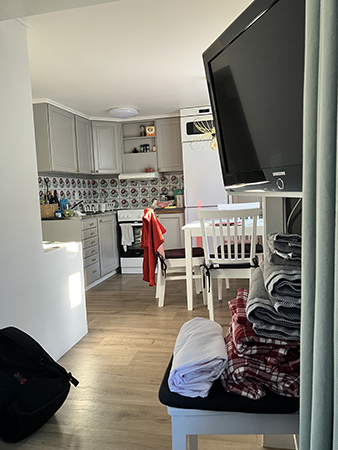 Utsikt från soffan mot köket på Rådstugugatan