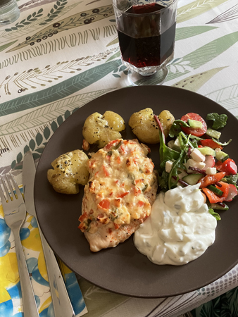 Kyckling kraschad potatis grönsaker tzatziki GWs röda