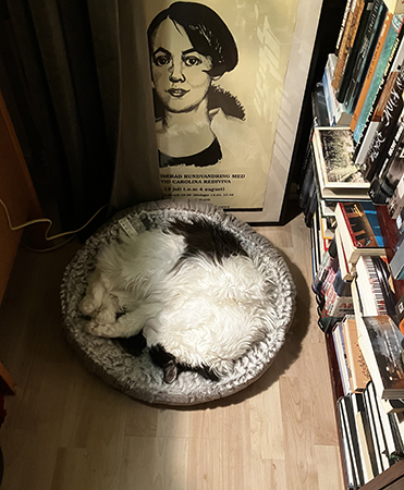 Lucifer provade lilla kattkorgen, övervakad av Karin Boye på en affisch av Stina Wollter, en gåva från Stinas mamma Annie.