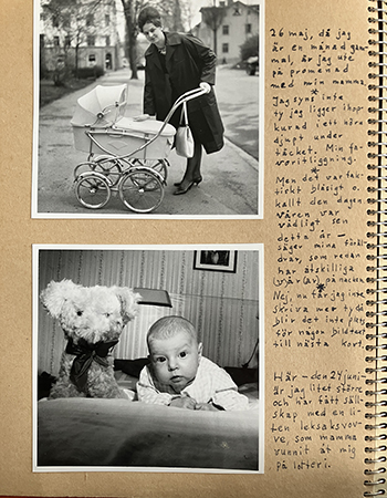 Mamma i högklackat med barnvagn och jag med en nalle som är större än jag själv.