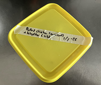 Matlåda med gult lock och pulled chicken o klyftor inuti