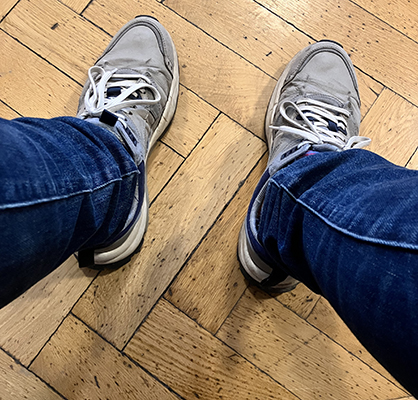 Mina fötter i gråa jympadojor i väntrummet