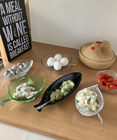 Tre sorters sill, ägg, Alséns röra, tomater och en skum höna.